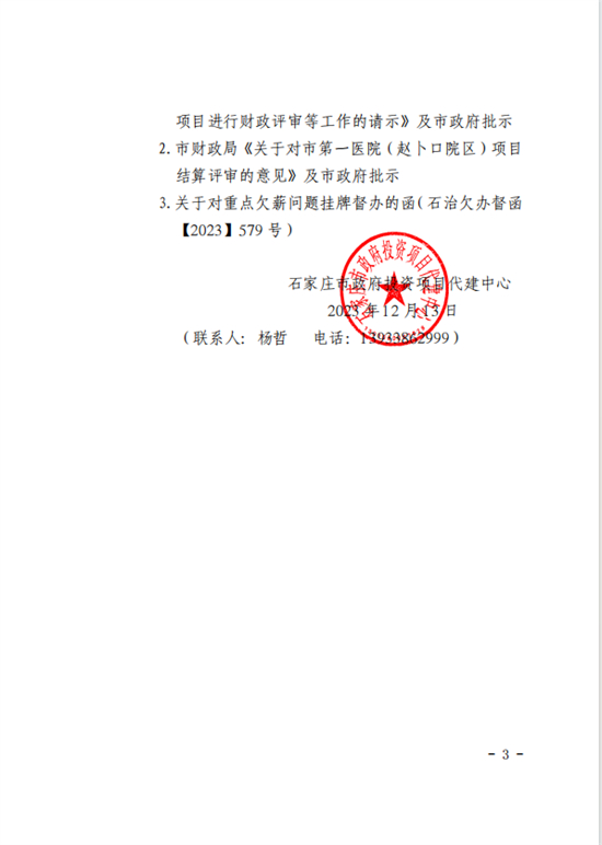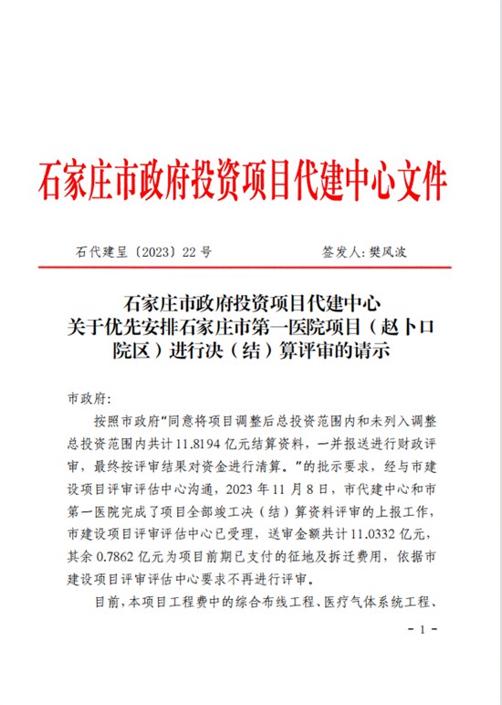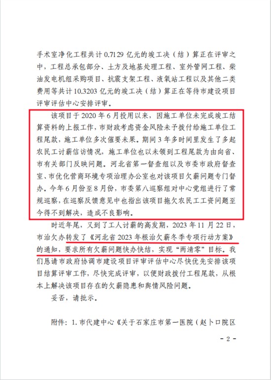 2023年12月,石家庄市政府投资项目代建中心发文,向石家庄市政府“关于优先安排石家庄市第一医院项目(赵卜口院区)进行决(结)算评审的请示”,恳请市政府协调市建设项目评审评估中心尽快优先安排该项目结算评审工作,尽快完成评审,以便财政拨付工程尾款,从根本上解决该项目存在的欠薪隐患和舆情风险问题。得到的批复中明确要求:所有欠薪问题快办快结,实现“两清零”目标。但结付工资的事情依旧石沉大海......