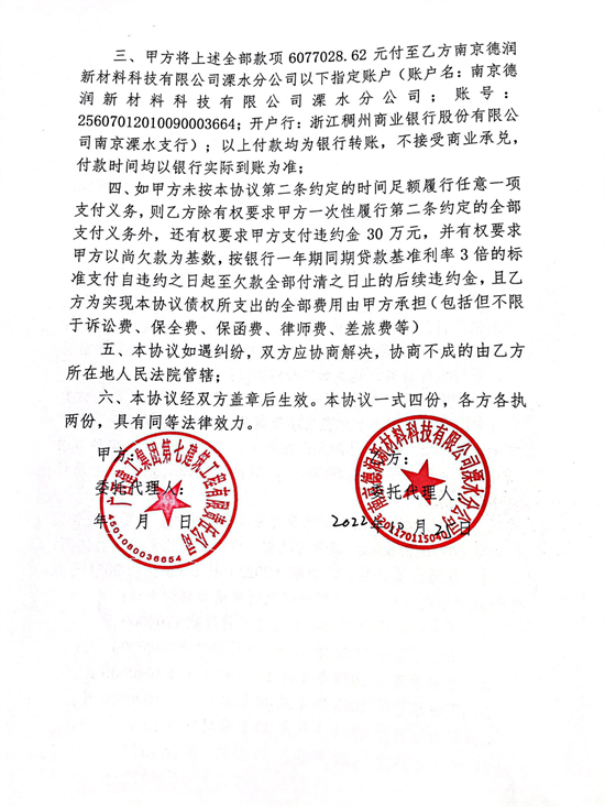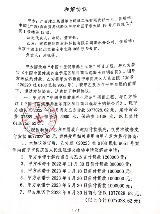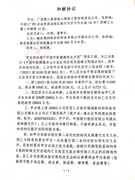 广西建工集团第七建筑工程有限责任公司与南京德润新材料科技有限公司溧水分公司和解协议: