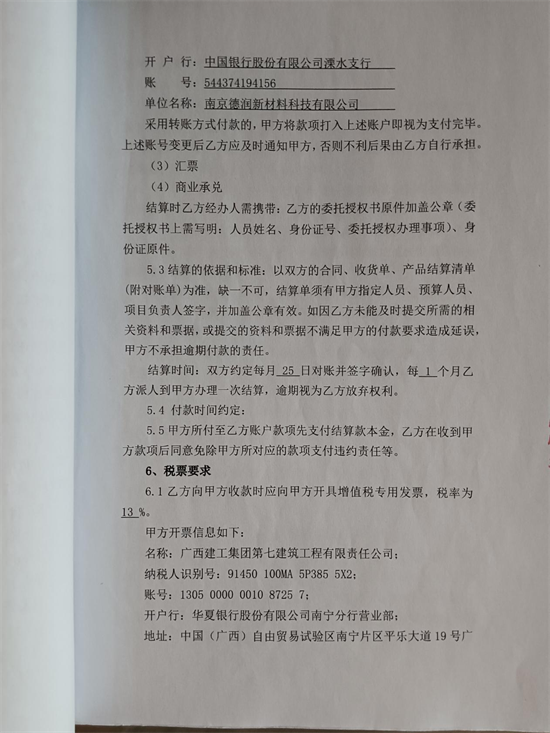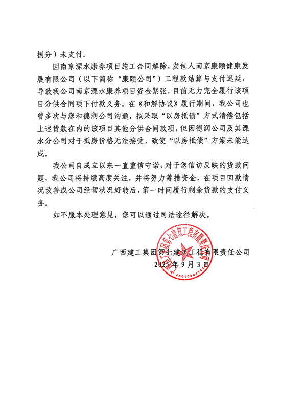 万般无奈,乙方南京德润新材料科技有限公司溧水分公司通过信访和媒体,多次发信向广西建工集团总部诉求。投诉几个月后,广西建工集团第七建筑工程有限责任公司仅发来张告知书(编号:034500000000000010325640),“告知书”承诺9月13日前办结并书面回复。