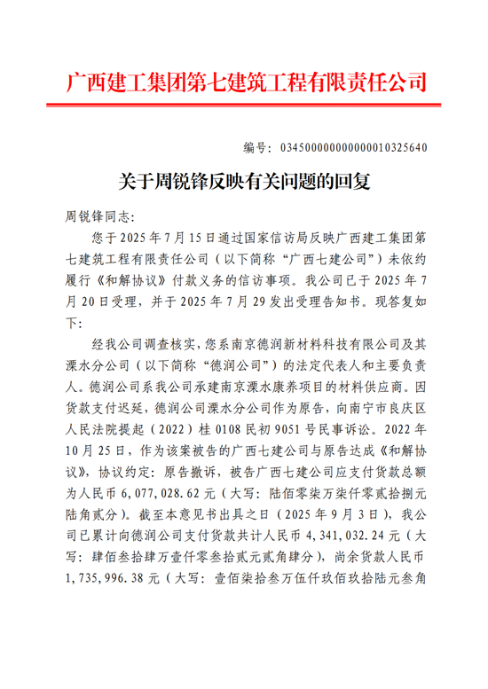 然而让人没想到的是,在《广西建工集团第七建筑工程有限责任公司关于周锐锋反映有关问题的回复(编号:034500000000000010325640)》中,居然自行抹去了一百万的还款额,公然谎称:“截至本意见书出具之日(2025年9月3日),我公司已累计向德润公司支付货款共计人民币4,341032.24 元(大写:肆佰叁拾肆万壹仟零叁拾贰元贰角肆分),尚余货款人民币1,735,996.38元(大写:壹佰柒拾参万伍仟玖佰玖拾陆元参角捌分)未支付”。如今是信息时代,双方公对公转账都有交易流水明细,明明还欠款300万元,在投诉后的“结果”居然被凭空抹去的100万元是何居心?